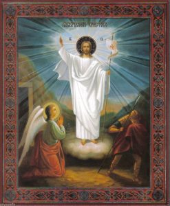 “Kristus telah bangkit dari mati, dengan matinya telah menginjak-injak maut, dan kepada mereka yang dikuburan : hidup menganugerahkan!”