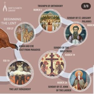 6. ) *Minggu St. Yohanes Klimakus ( _Sunday of St. John Climacus_ ),* untuk mengingatkan bahwa melalui penyaliban diri untuk mencapai pemulihan gambar di dalam Kristus itu tak dapat dilakukan sekaligus namun melalui tahapan-tahapan seperti tangga (klimaks).
